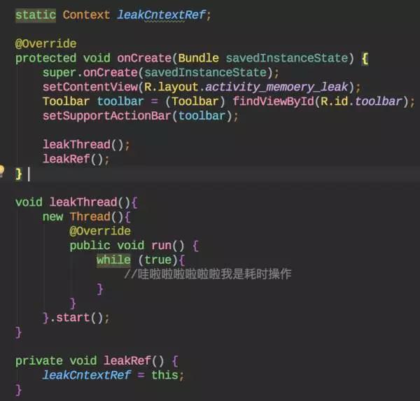能夠看到顯式的有一個(gè)leakCntextRef引證,這闡明我們有一個(gè)名為leakCntextRef的引證持有了activity。回過(guò)頭看看我們的代碼,公然,驗(yàn)證的沒(méi)錯(cuò)。