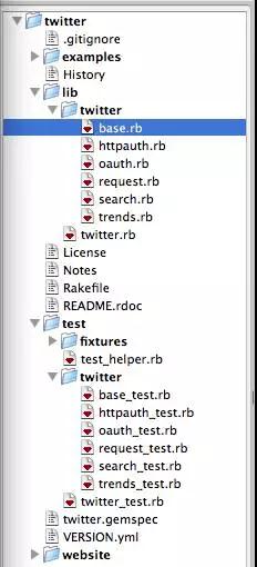 首先注意文件結(jié)構(gòu)。這一步可以使用一個(gè)有文件夾層次結(jié)構(gòu)視圖的編輯器(如 TextMate),比如,這是一個(gè)很好的Twitter Ruby gem 總覽。