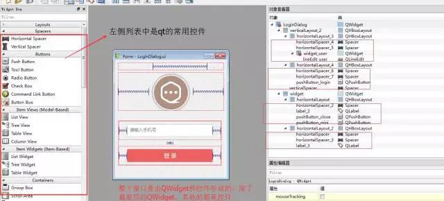 上圖中被紅框圈起來的,是頁面中的布局,布局可以用手寫,我們這處只展覽預(yù)設(shè) 師中處置的布局。布局分為四種,我們這處用到達簡單的兩種,橫向布局 (QHBoxLayout)向布局(QVBoxLayout)。