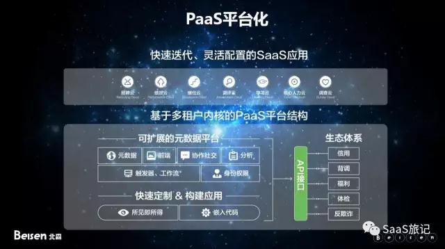 關(guān)于SaaS的新進(jìn)入者,要直面劇烈的競(jìng)賽,現(xiàn)已沒有時(shí)刻去構(gòu)建一個(gè)PaaS渠道,別的一個(gè)挑選是在北森這么的PaaS渠道上去構(gòu)建自個(gè)的SaaS軟件,幾個(gè)月后就可以和大廠直接競(jìng)賽,去驗(yàn)證形式、取得客戶、贏得商場(chǎng)。