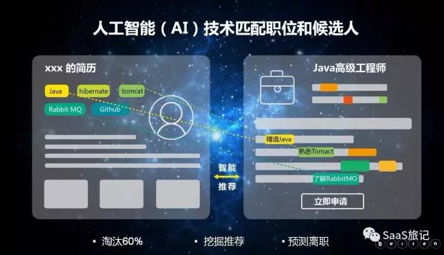 經(jīng)過(guò)一個(gè)事務(wù)場(chǎng)景,咱們看一下AI在SaaS商品中的使用:招聘辦理軟件,不只保留了簡(jiǎn)歷,還記載HR挑選簡(jiǎn)歷的做法,這么咱們可以經(jīng)過(guò)AI去判別HR在尋覓什么樣的提名人,然后做幾件工作:1)篩選無(wú)效的簡(jiǎn)歷,近60%,2)在公司的人才庫(kù)里邊,挖掘出合適的提名人,3)猜測(cè)人才庫(kù)里邊的人什么時(shí)刻有也許離任,引薦HR提早聯(lián)絡(luò)提名人。明顯,這就很大程度改變了HR的工作方法。