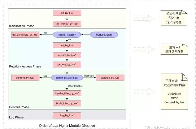 在實(shí)際的接口網(wǎng)關(guān)開發(fā)中,我們主要是使用到了 OpenResty 中初始化階段的 init_by_lua*、init_worker_by_lua*、重寫與訪問階段 的 rewrite_by_lua*、access_by_lua* 以及內(nèi)容生成階段 content_by_lua* 過程。
