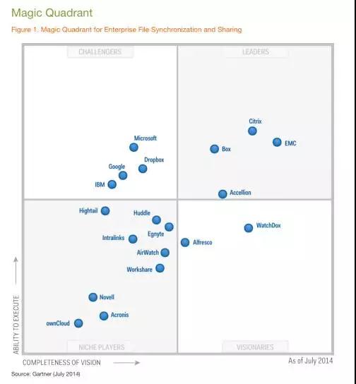 國際尖端科技咨詢公司Gartner曾針對2014年美國商場上企業(yè)級云存儲公司,依據(jù)其產(chǎn)品的快捷性、安全性、存儲容量等功用做過一個評級,并將其間優(yōu)異的公司依據(jù)各自特色作了一個分類: