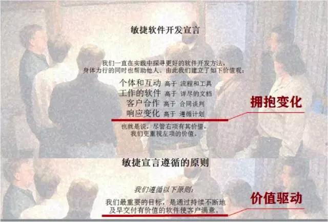 這些大型辦法論效果并不抱負(fù),一方面甲乙雙方在需求改動(dòng)上的扯皮不是影響交給日期就是交給后的產(chǎn)品不能實(shí)在處理客戶的問(wèn)題,另一方面研制團(tuán)隊(duì)又需求花費(fèi)許多精力在預(yù)備流程需求的文檔上面【注4】。正因而,其時(shí)一些正在活躍測(cè)驗(yàn)不同辦法的軟件開(kāi)發(fā)人員才會(huì)群英薈萃,提出聞名的《靈敏宣言》,如圖1。